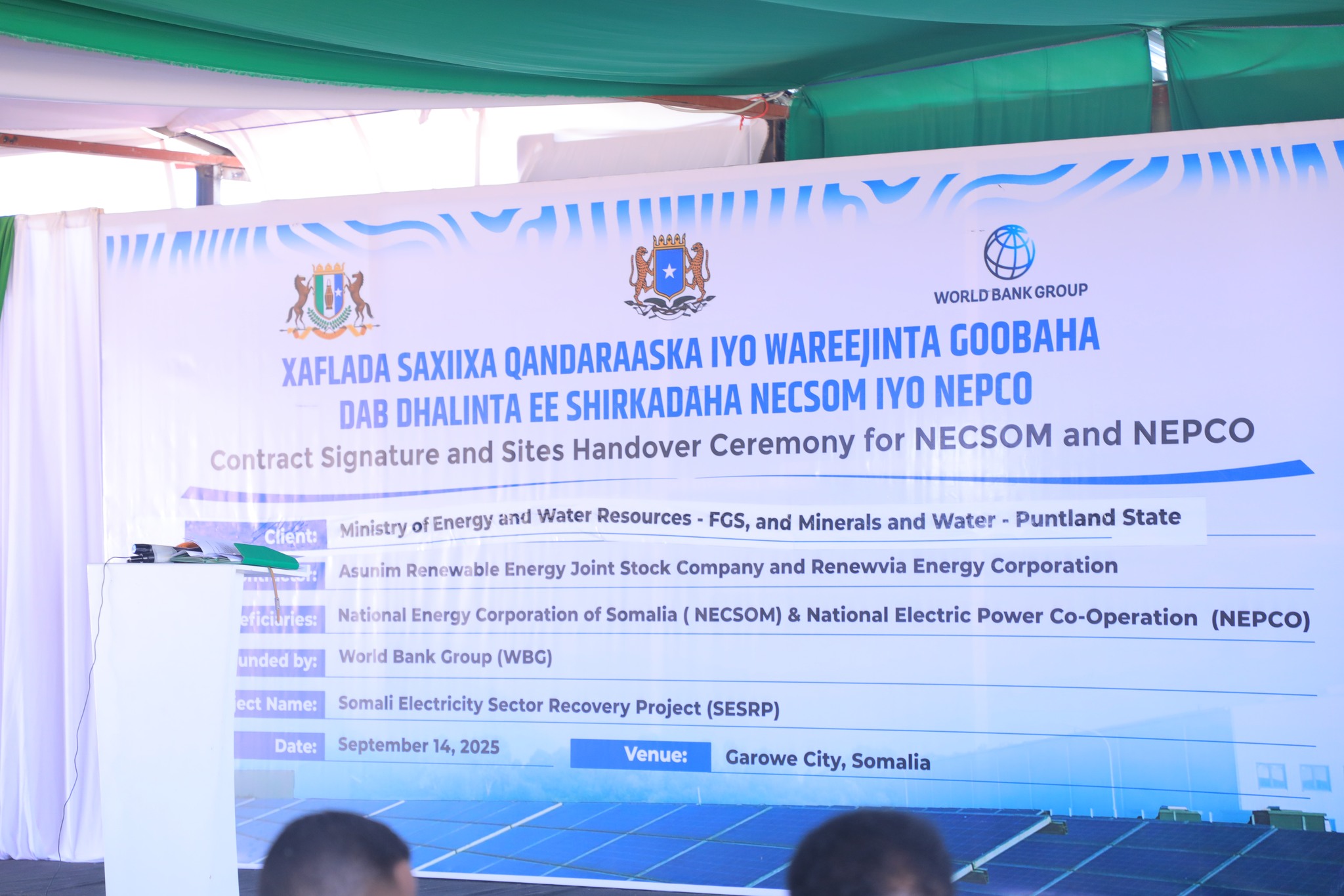 Wasiirka wasaaradda Tamarta, Macdanta iyo Biyaha dowladda Puntland Mudane LIiibaan Muuse Boqor oo uu weheliyo Agaasimaha Guud ee wasaaradda Tamarta, Macdanta iyo Biyaha ayaa ka qayb-galay xaflada saxiixa iyo Wareejinta xarumaha laga hirgelin doono mashruuca sookabashada Tamarta, oo uu maalgaliyo Bangiga Aduunka (World Bank) mashruuc oo looyaqaan SESRP, ama ILEYS waxaana ka faa’ideysanaya magaalooyinka Garoowe iyo Gaalkacayo ee dowladda Puntland.
